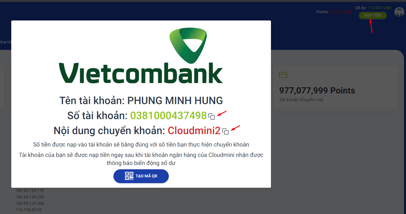 Click vào nút nạp tiền bên cạnh user sẽ hiện lên thông tin chuyển khoảng và nội dung chuyển khoảng, khách hàng vui lòng ghi đúng nội dung để hệ thống tự động cộng tiền vào tài khoản .
